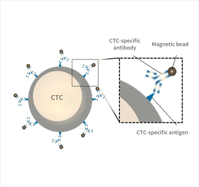 GenoCTC는 자성비드(Magnet bead)와 암세포 특이적 생체표지자(EpCAM, MET 등)를 대상으로 하는