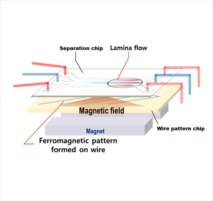 Cancer cells coated with magnetic beads, are specifically guided towards the buffer channel by the magnetized wire pattern chip, and separated specifically with minimal contamination of blood cells, yielding high purity CTCs.